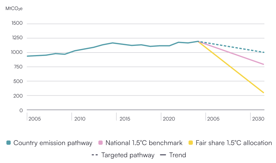 A country’s fair share of the global carbon budget is calculated based on three equally-weighted variables: population, PPP-adjusted GDP per capita and historical emissions. These three variables respectively represent equality, capability and responsibility, which are the primary factors to consider when developing a fair share approach to climate mitigation. For more information, see the ASCOR methodology note. The graph presented here is a provisional assessment pending the feedback process that the ASCOR tool coordinates with country governments ahead of publishing its results and may differ slightly from what is published on the ASCOR tool in Q4 2025.